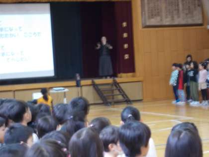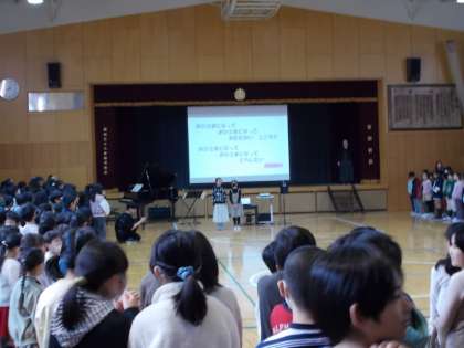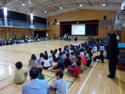 音楽朝会(12月11日) 公開日 2023/12/11 更新日 2023/12/11 今日のできごと 新型コロナウイルス感染症の5類感染症移行後、初となる音楽朝会を実施、全校で歌声を響かせました。楽曲は「お陽さまになって」(作詞・作曲:中山 真理)、5年児童が伴奏のピアノや副次的旋律のグロッケンシュピールを担当しました。