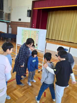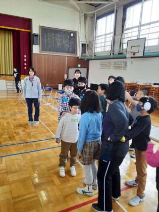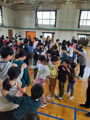 じゃんけん列車をしました。4校がつながり、長ーい列車になりました。