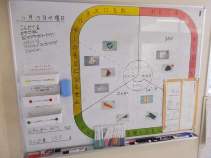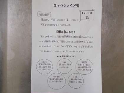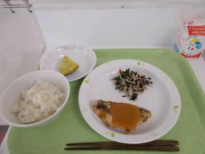 献立は、麦ごはん、牛乳、アジのピリ辛ソースかけ、大根とひじきのサラダ、ふかし芋でした。
