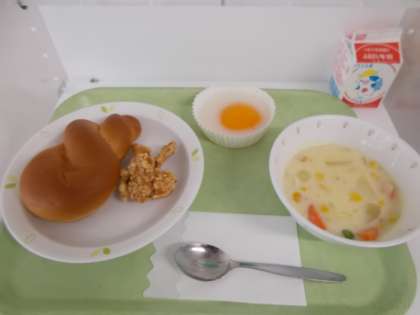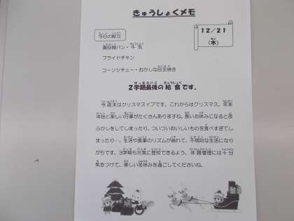 給食(12月21日) 公開日 2023/12/21 更新日 2023/12/21 今日のできごと 献立は、黒砂糖パン、牛乳、フライドチキン、コーンシチュー、おかしな目玉焼きでした。 本日で2学期の給食は終了です。