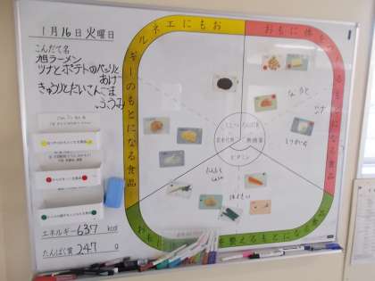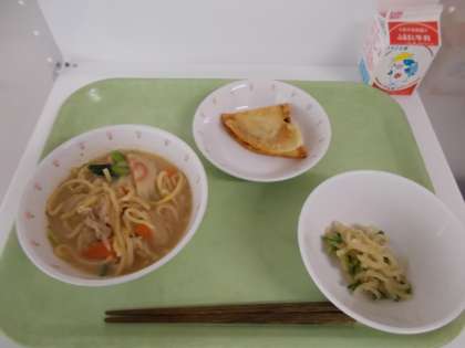 献立は、旭ラーメン、牛乳、ツナとポテトのパリっと揚げ、キュウリと大根の胡麻風味でした。