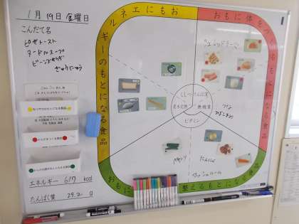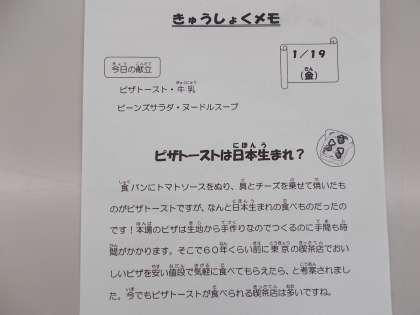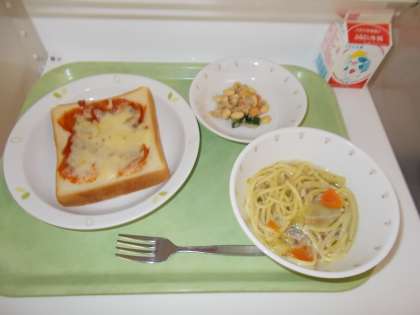 献立は、ピザトースト、牛乳、ビーンズサラダ、ヌードルスープでした。