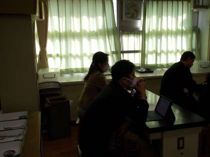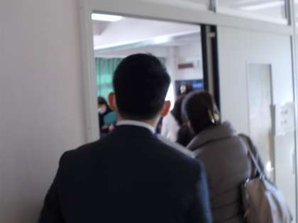 写真は、駒留中学校の授業観察をしている旭小教員の様子(一部)です。