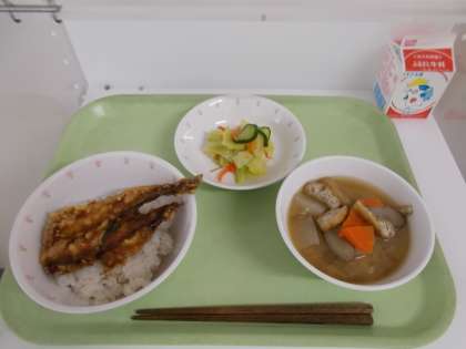 献立は、鰯の蒲焼丼、牛乳、即席漬、呉汁でした。
