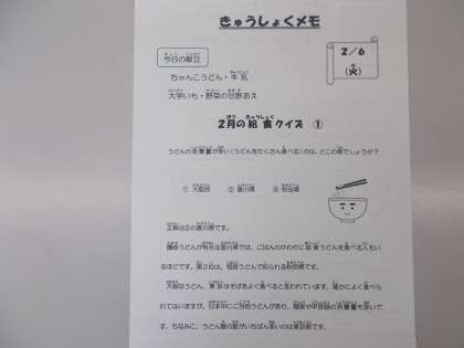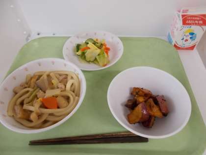 献立は、ちゃんこうどん、牛乳、大学芋、野菜の甘酢あえでした。