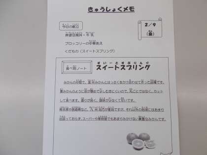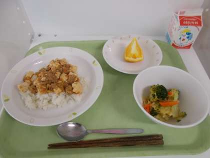 献立は、麻婆豆腐丼、牛乳、ブロッコリーの中華あえ、スイートスプリングでした。