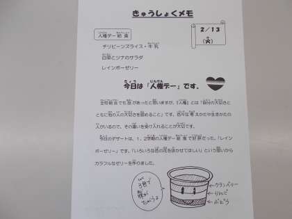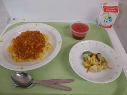 献立は、チリビーンズライス、牛乳、白菜とツナのサラダ、レインボーゼリーでした。