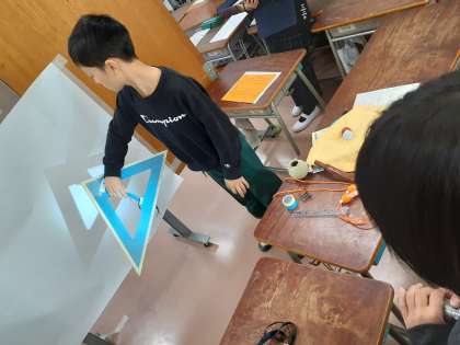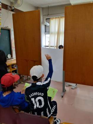 学校にあるものに光を当ててできた影を見て、何か答えるゲームです。