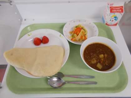 献立は、ナン、牛乳、キーマカレー、野菜のドレッシングあえ、苺でした。