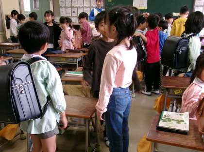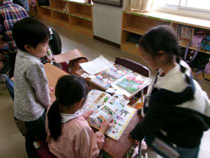 対面し「よろしくお願いします」のごあいさつの後は、園の子たちにランドセルを背負わせたり、教科書などを見せたりと、小学校生活を体験させました。次に、事前に準備した手作りおもちゃ「パッチンがえる」をプレゼントし、絵を描かせたり、遊び方を教え一緒に遊んだりしました。お別れでは、お互いに「ありがとうございました」とごあいさつ。短い時間でしたが、すっかり打ち解けたようで、ハイタッチをしながら、別れを惜しんでいました。