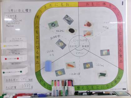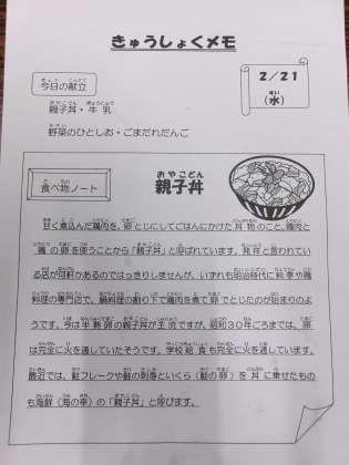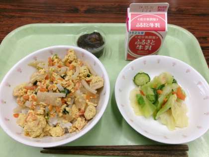 今日の献立は、親子丼、牛乳、野菜のひとしお、ごまだれだんご、でした。