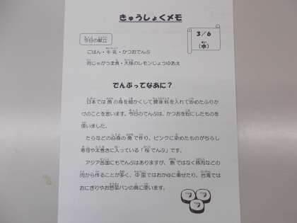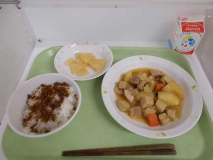 献立は、牛乳、かつおでんぶ、肉じゃがうま煮、大根のレモン醤油和えでした。