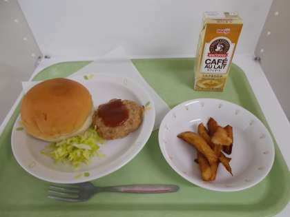 献立は、セルフチーズバーガー、フライドポテト、コーヒー牛乳でした。