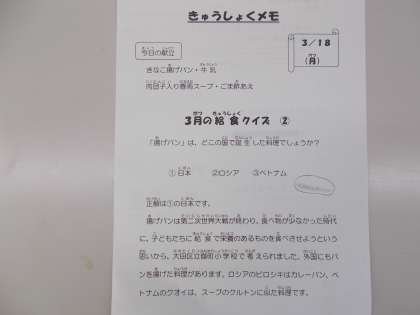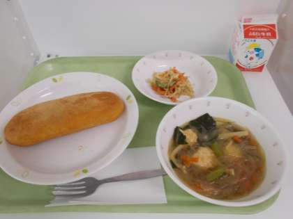 献立は、きなこ揚げパン、牛乳、肉団子入り春雨スープ、ごま酢あえでした。