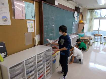 机、椅子の移動が済んだところで、「新1年生教室」「配布物」等 係に分かれて作業を進めました。