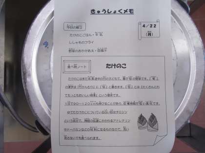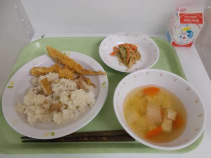献立は、タケノコご飯、牛乳、シシャモのフライ、野菜のおかかあえ、豆腐汁でした。