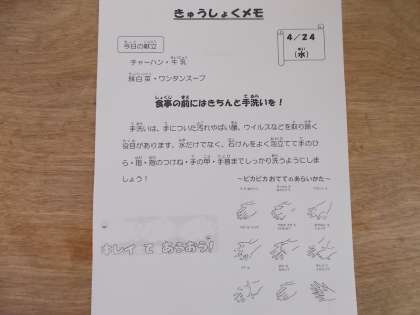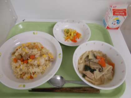 献立は、チャーハン、牛乳、辣白菜、ワンタンスープでした。