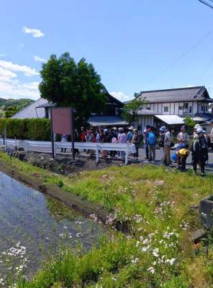 宮田果樹園を後にし、村めぐり再開です。江戸時代にできた川場用水路の説明を聞き、むらを守る大わらじの前で記念撮影をしました。