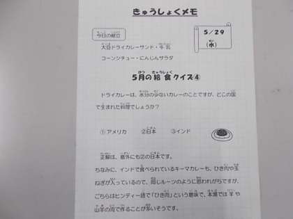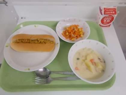 献立は、大豆ドライカレーサンド、牛乳、コーンシチュー、にんじんサラダでした。