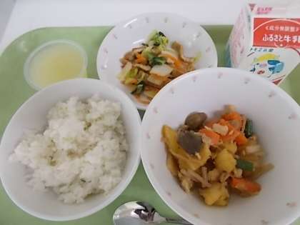 献立は、麦ごはん、牛乳、きんぴら煮、青菜と油揚げの煮びたし、りんごゼリーでした。