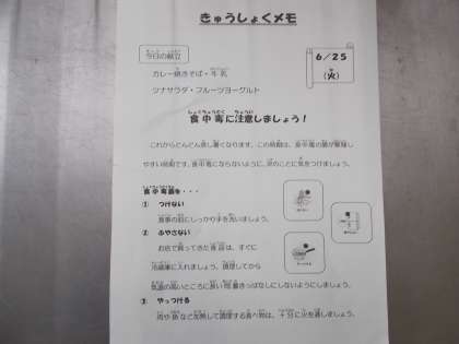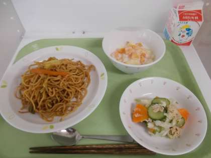 献立は、カレー焼きそば、牛乳、ツナサラダ、フルーツヨーグルトでした。
