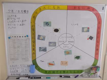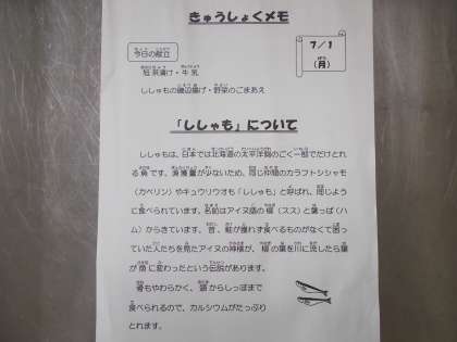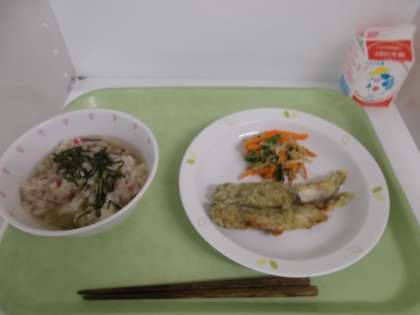 献立は、旭茶漬け、牛乳、シシャモの磯辺揚げ、野菜の胡麻和えでした。