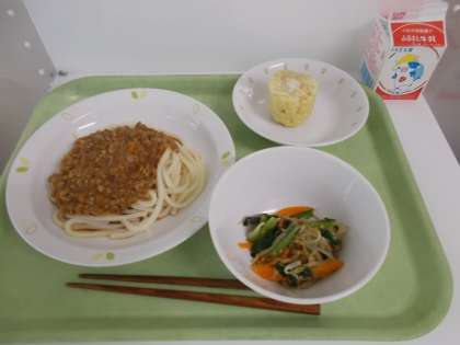 献立は、ジャージャーうどん、牛乳、塩ナムル、蒸しトウモロコシでした。