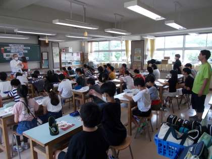 日本醤油協会「しょうゆもの知り博士」の門澤 利夫様をお迎えし、3,4校時に実施しました。写真は3校時6の1の様子です。