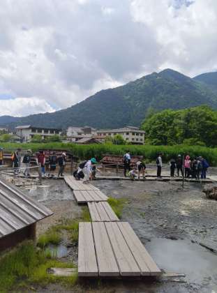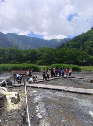 1組、2組分かれて、源泉と足湯を交互に行いました。
