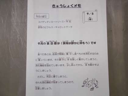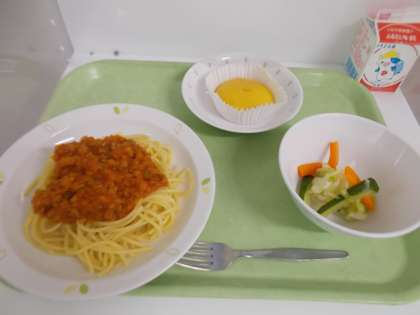 献立は、スパゲッティミートソース、牛乳、野菜のピクルス、キャロットケーキでした。