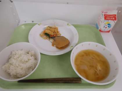 献立は、麦ごはん、牛乳、鯖のピリ辛ソースかけ、カリカリ油揚げと野菜のおひたし、味噌汁でした。