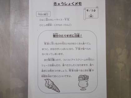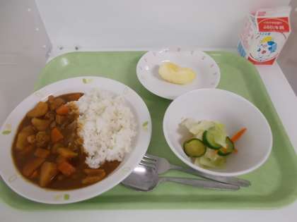献立は、ひよこ豆のカレーライス、牛乳、ひとしお野菜、林檎でした。