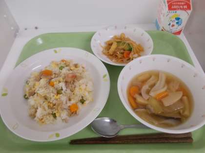 献立は、チャーハン、牛乳、もやしのコチュジャンあえ、ワンタンスープでした。
