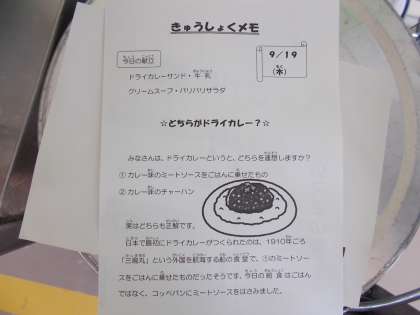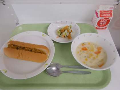献立は、ドライカレーサンド、牛乳、クリームスープ、パリパリサラダでした。