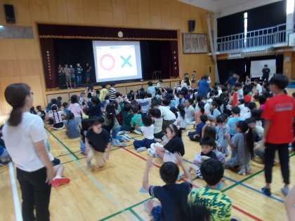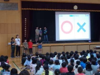 児童集会(9月24日) 公開日 2024/09/24 更新日 2024/09/24 今日のできごと 集会委員会による「〇×クイズ」を実施しました。 クイズ終了後、看護当番の教員から今週の生活目標についての話と、本日から4週間実施する教育実習生の紹介を行いました。