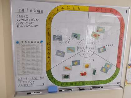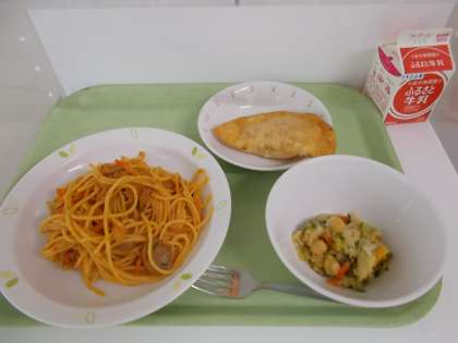 献立は、スパゲッティナポリタン、牛乳、イタリアンサラダ、煮林檎の包み揚げでした。