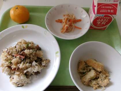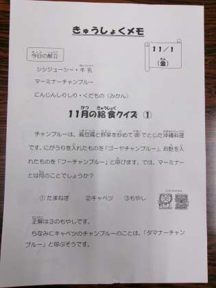 献立は、シシジューシー、マーミナーチャンプルー、にんじんしりしり、くだもの(みかん)でした。