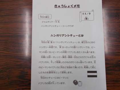 献立は、ジャムサンド、牛乳、ハンガリアンシチュー、コーンサラダでした。