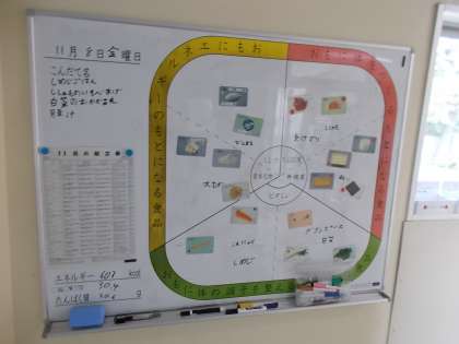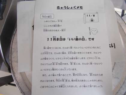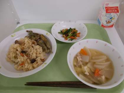 献立は、しめじごはん、牛乳、ししゃもの磯辺揚げ、白菜のおかかあえ、豚汁でした。