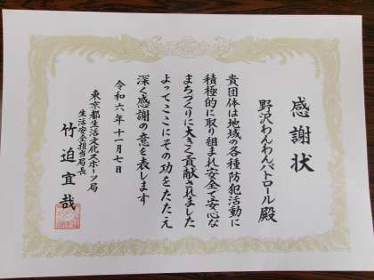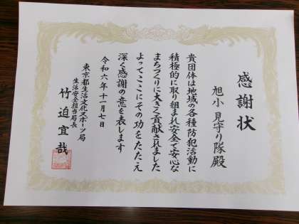 旭小見守り隊と野沢わんわんパトロールが、日頃よりの活動を認められ、東京都より表彰されたと、野沢2丁目町会長よりご報告をいただきました。