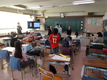 写真上から放送、給食、環境美化の各委員会の様子です。