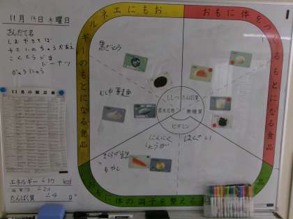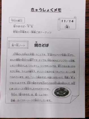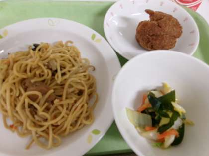 献立は、塩やきそば、牛乳、野菜の中華あえ、黒糖ごまドーナツでした。