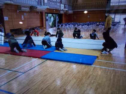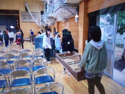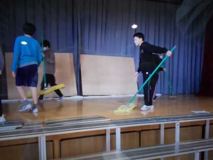 学芸会体育館会場設営(11月15日) 公開日 2024/11/18 更新日 2024/11/18 今日のできごと 15日(金)6校時に6年生と教職員で学芸会の会場設営を行いました。 6年生は、客席の椅子マット設営、舞台や舞台脇の設営だけでなく、普段綿埃等で汚れが目立っていた体育館の清掃もふくめ、しっかりと働きました。