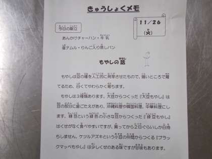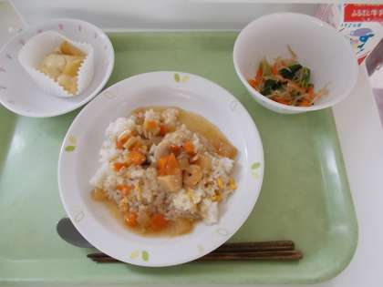 献立は、あんかけチャーハン、牛乳、塩ナムル、林檎入り蒸しパンでした。