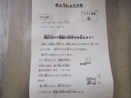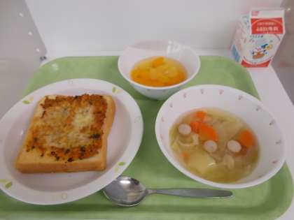 献立は、ミートチーズトースト、牛乳、ポトフ、フルーツポンチでした。