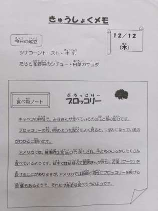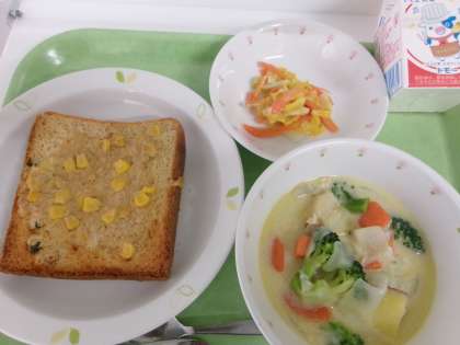 今日の献立は、ツナコーントースト、牛乳、たらと冬野菜のシチュー、白菜のサラダです。