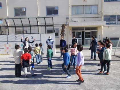 「芝生の上でキンボール」(12月14日) 公開日 2024/12/16 更新日 2024/12/16 今日のできごと 旭の庭わくわく隊主催によるスポーツイベント。 今回はキンボールです。 「校長先生のお話」、スタッフ紹介の後、まずは芝生の上でウォーミングアップです。