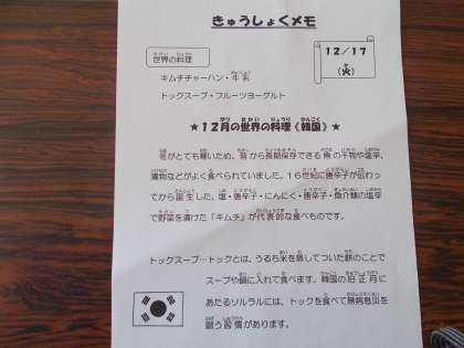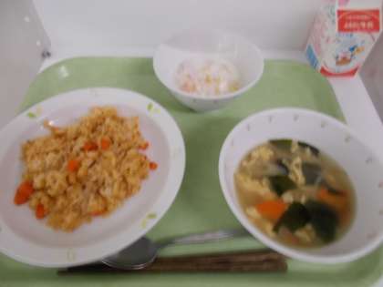 献立は、キムチチャーハン、牛乳、トックスープ、フルーツヨーグルトでした。