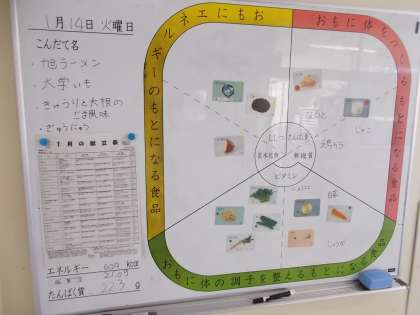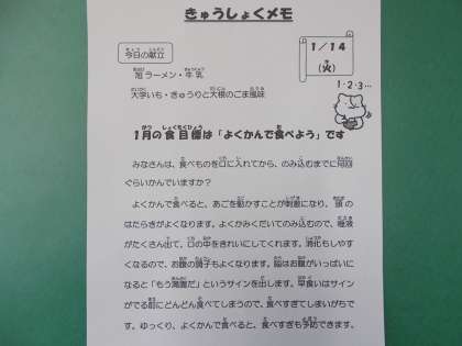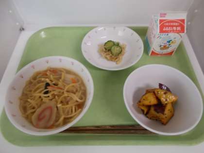 献立は、旭ラーメン、牛乳、大学いも、きゅうりと大根のごま風味でした。