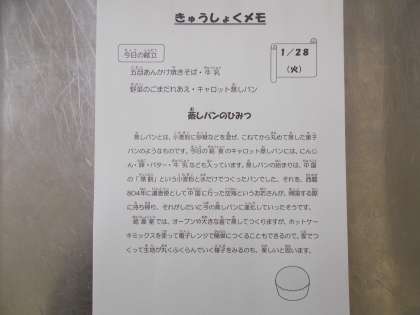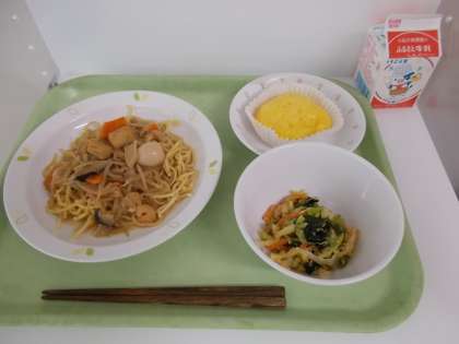 献立は、五目あんかけ焼きそば、牛乳、野菜のごまだれあえ、キャロット蒸しパンでした。